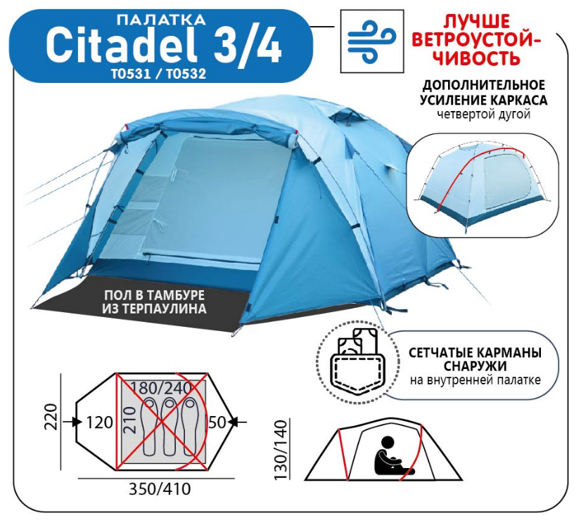 В 2025 году палатки BTrace объединили полубочку и полусферу, увеличив объем на 20% без значительного веса. Новый синий дизайн, ткани с RipStop и защитой от УФ. Пол из полиэстера долговечнее терпаулина. Усиленный фибергласс 8,5/9,5 мм, дополнительная дуга, съемный пол в тамбуре и наружные карманы. Вес 6650 г, водостойкость тента 6000 мм, дна 8000 мм. В комплекте колышки, оттяжки, инструкция.