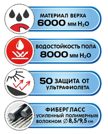 - внимание к тканям и дугам – прочные, надёжные, долговечные. Тент с RipStop для надёжности и дополнительная пропитка для защиты от УФ лучей (не защищает полностью, но продлевает срок службы по сравнению с обычными).