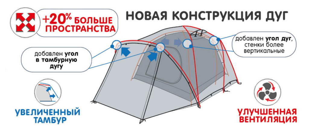 - уникальная конструкция даёт прирос +20% к объёму палатки при незначительном увеличении веса